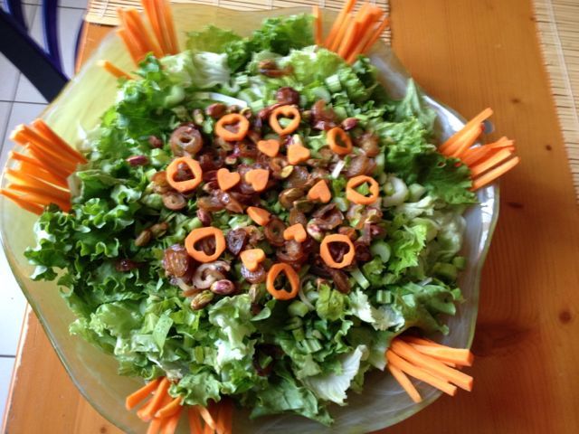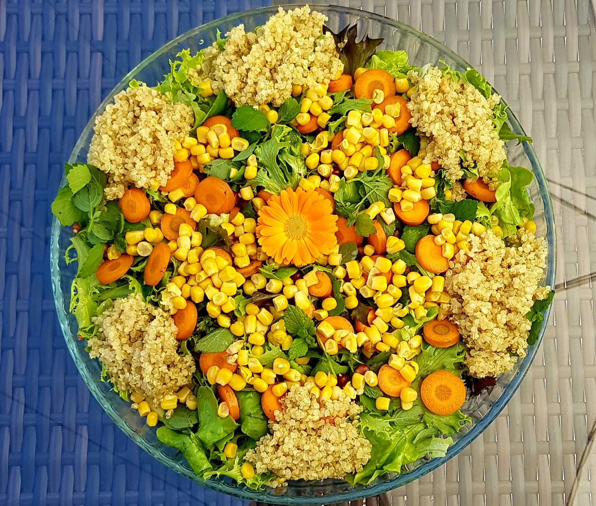 - Das Mittagessen besteht aus einer grossen Salat- und Gemüseplatte mit Beilagen wie Ofenkartoffeln, Süsskartoffeln, Quinoa, Kichererbsen, Linsen, Mais, Hirse oder Amaranth, Grillkäse, Ofengemüse und leckeren Dips (auch vegane).
