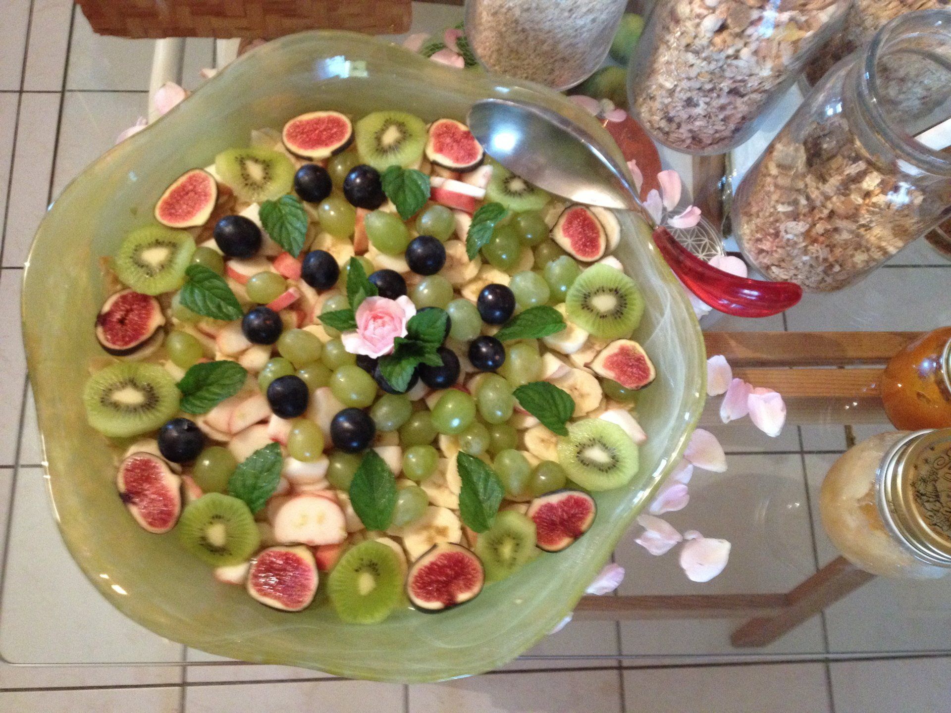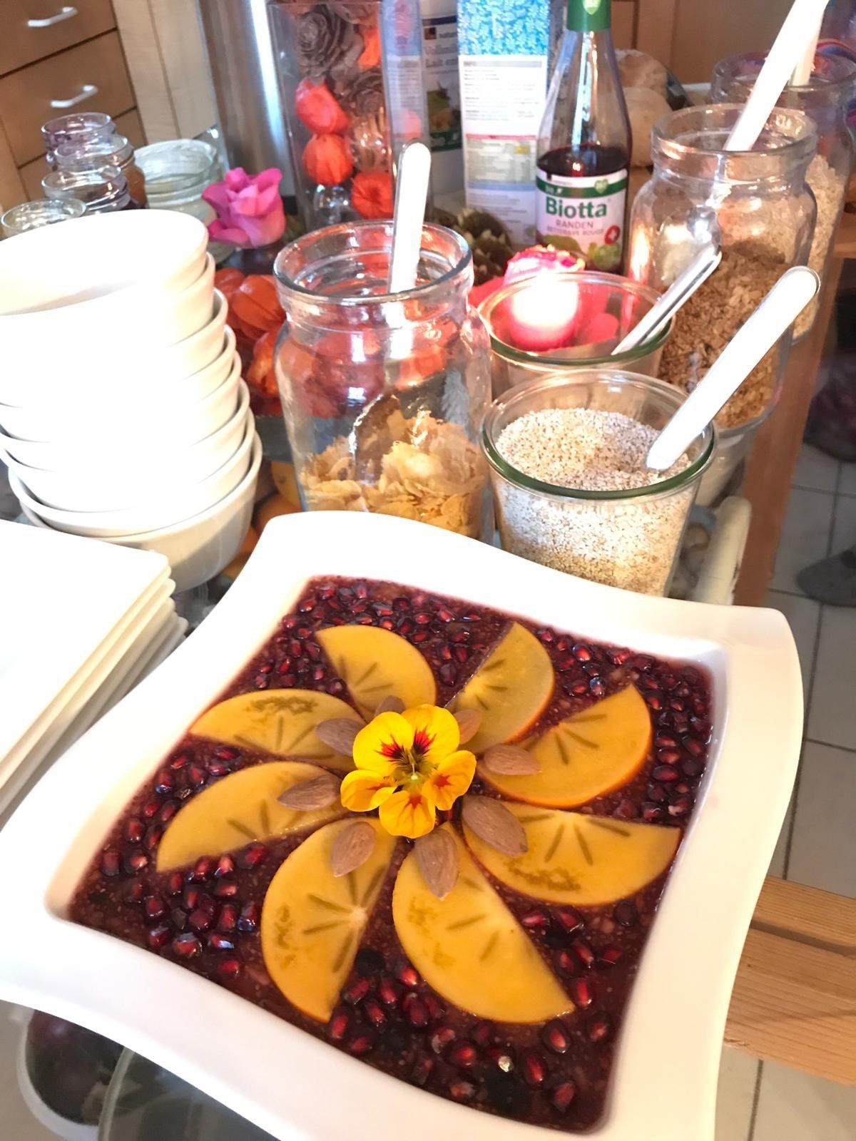 - Zum Frühstück gibt es alles was Dein Herz begehrt: Verschiedene Müesliflocken, frische Früchte, Samen, Nüsse, getrocknete Früchte, selbst gebackenes Dinkel- oder Buchweizenbrot, Konfitüre, Honig, Käse, Kaffee oder Tee.